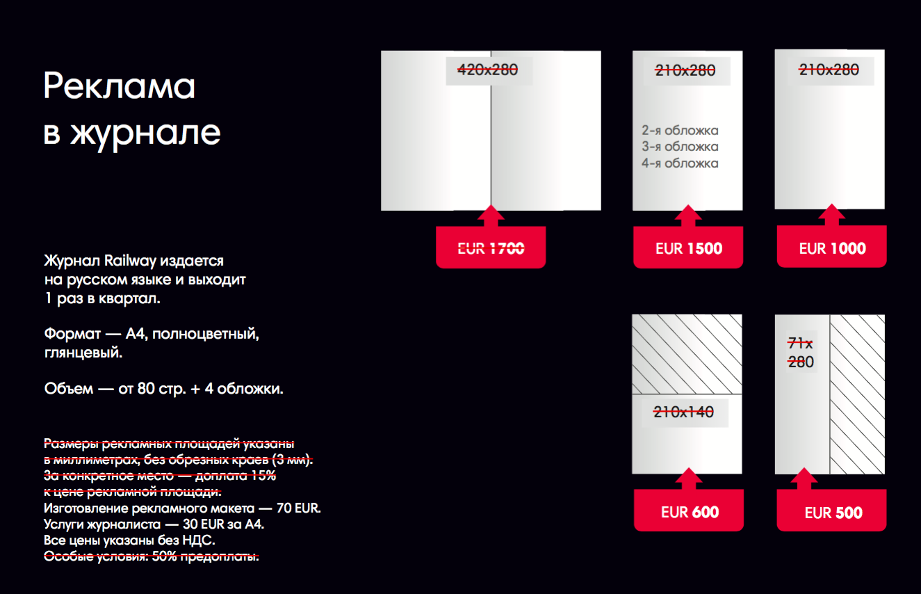 - 1-я обложка (требуется тематическое согласование снимка и текста с редакцией) — 4 000 евро,