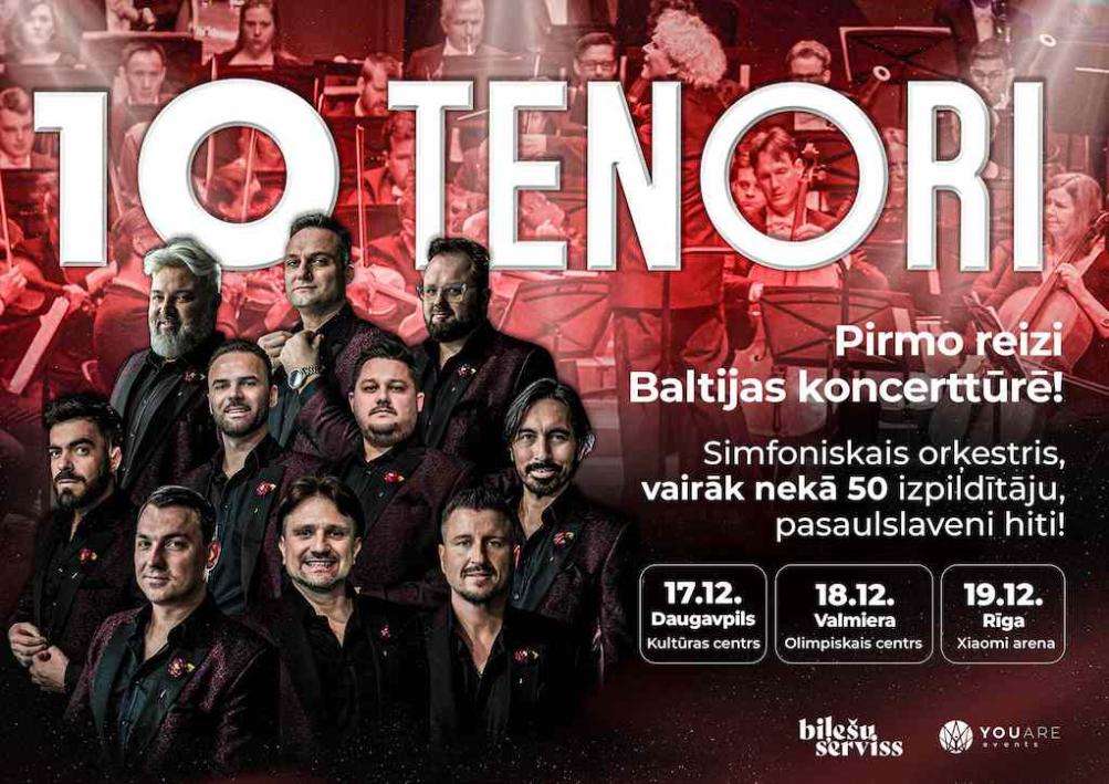 Летние выступления «10 Tenors» в Юрмале и Лиепае вызвали настоящий фурор — концерты проходили при аншлагах, зрители встречали артистов бурными овациями и не отпускали их со сцены. Композиция «Debesis iekrita tevī…», исполненная на латышском языке, дважды прозвучала на бис. В этот раз в рижском концерте примут участие и латвийские звезды – самобытный этно-поп-коллектив Tautumeitas и блистательная вокалистка Саманта Тина, а ведущим вечера станет харизматичный певец и телеведущий Роберто Мелони. В роли ведущего концерта в Валмиере выступит популярный латвийский актер театра и кино Имантс Страдс.